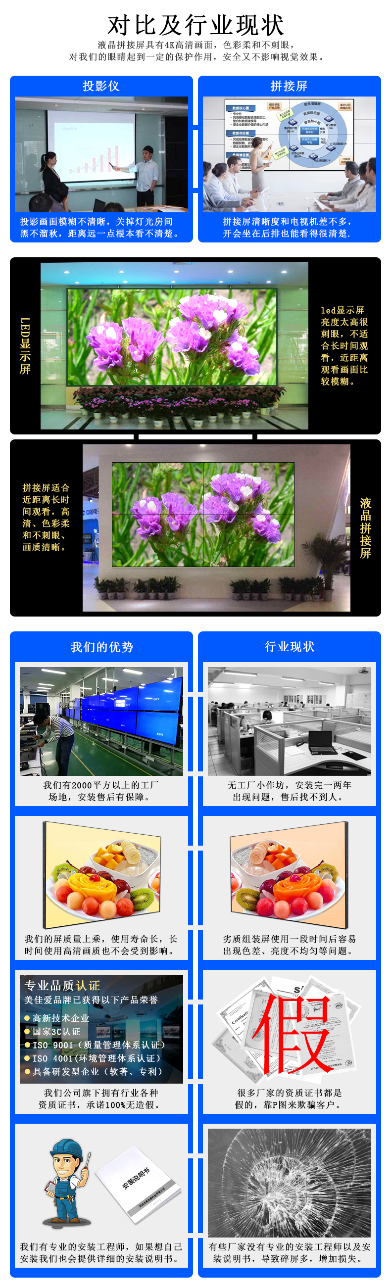 【美佳愛-4k液晶拼接屏生產(chǎn)廠家電話400-997-9971】原裝LG55寸液晶拼接屏3.5mm產(chǎn)品通過ISO9001_3C_節(jié)能認證等30多項認證,主營LG/京東方/三星大屏幕電視墻,其尺寸有32寸40寸43寸46寸49寸55寸65寸75寸液晶拼接單元,也有曲面,弧形,柔性,無縫LED顯示屏,顯示器,超窄邊高清監(jiān)視器,提供企業(yè)展廳展示,KTV,酒吧,會議室,視頻監(jiān)控系統(tǒng)解決方案設(shè)計-報價-安裝施工-售后超窄邊維修等服務(wù)