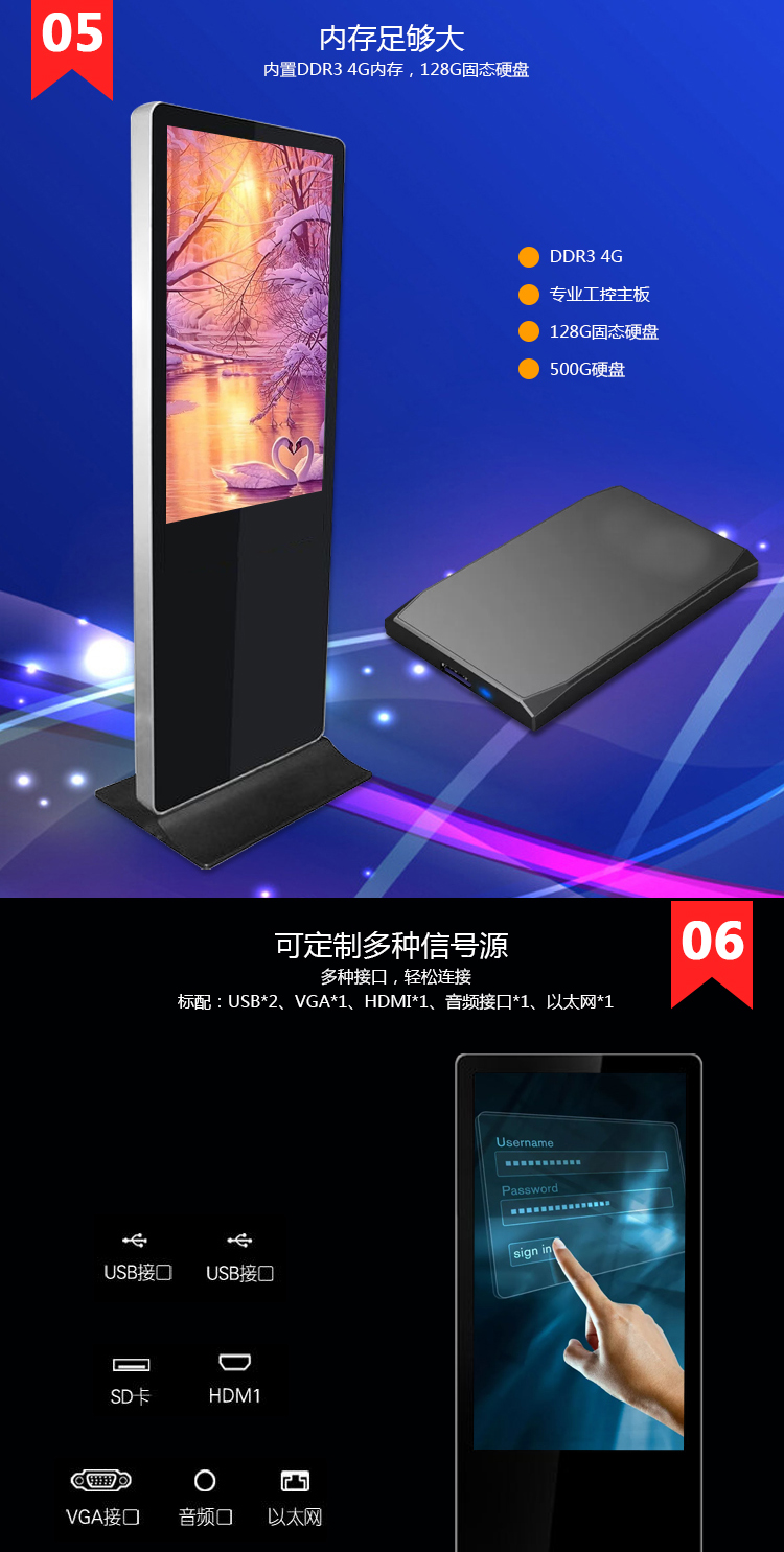 | - 觸摸方式:通過(guò)后臺(tái)發(fā)布模板鏈接網(wǎng)頁(yè)到終端設(shè)備,當(dāng)沒(méi)人觸碰顯示屏?xí)r正常播放廣告,當(dāng)有人觸摸時(shí)自動(dòng)進(jìn)入觸控鏈接模板