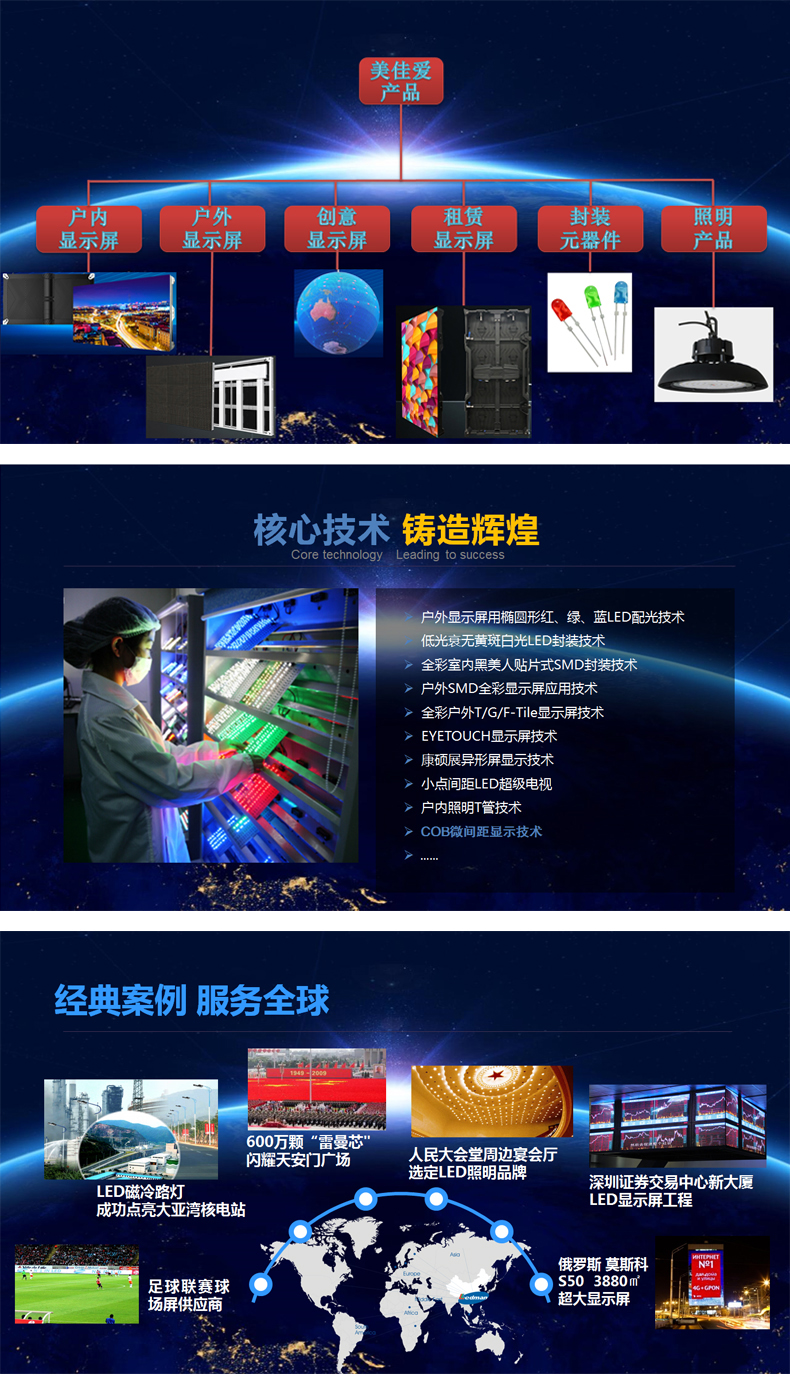 The accomplished COB ultra-fine pitch smart LED display products with less physical stitching, more extreme smooth display, greener and safer applications, stronger protection performance and environmental adaptability. Widely telemedicine, command and control room, radio and television broadcasting, educational conferences, sports media, electronic games and other indoor display applica tion | |