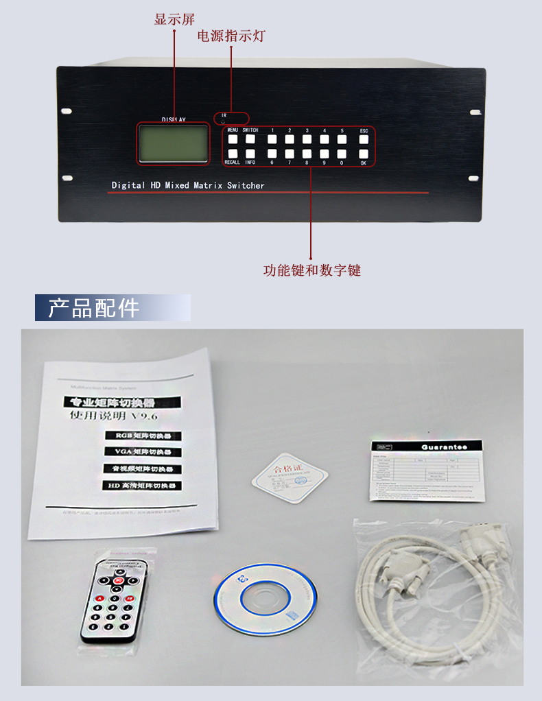 DVI高清全數字矩陣切換器, 所有端口支持藍光DVD(支持HDCP);輸入輸出自動均衡,輸入加輸出傳輸距離大于40米(不需配帶芯片的DVI線);鋁拉絲面板,帶藍光液晶顯示屏顯示操作狀態;帶串口控制,可選配網口;所有輸入端口支持現場寫EDID,所有輸出端口可讀回EDID。